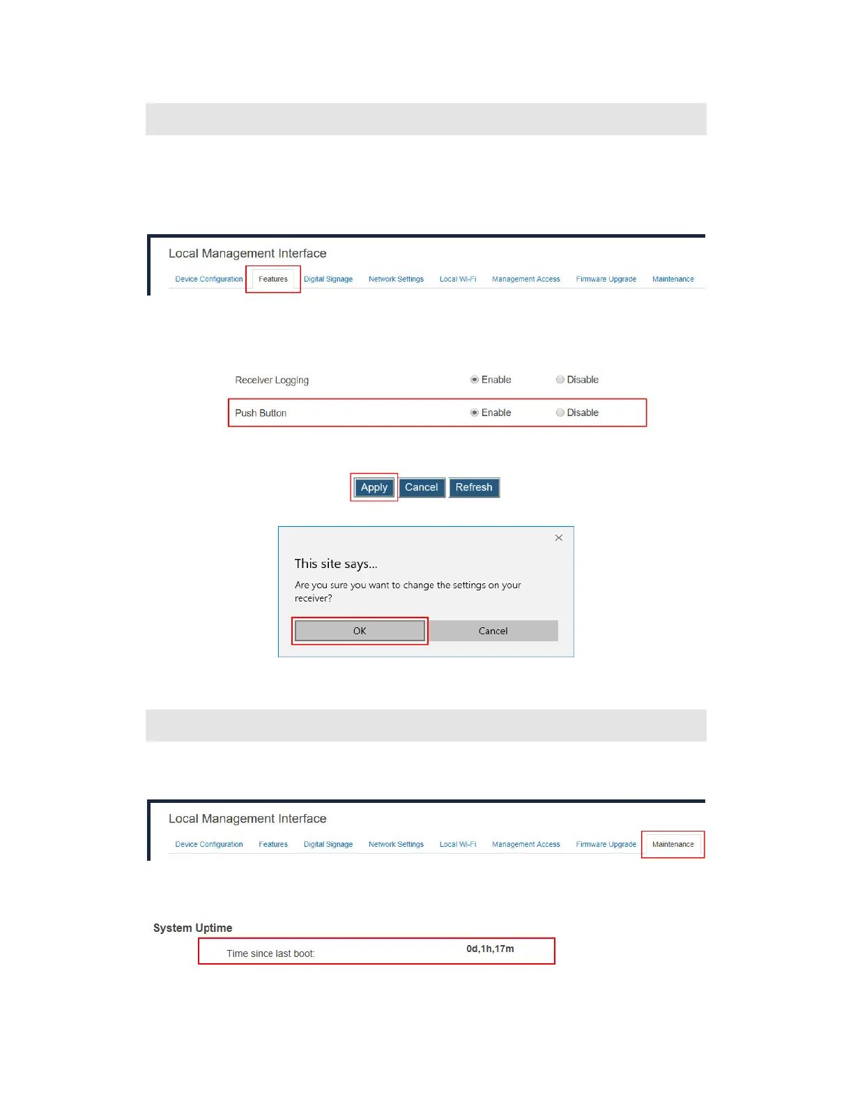 To view the receiver’s system uptime, follow this procedure: