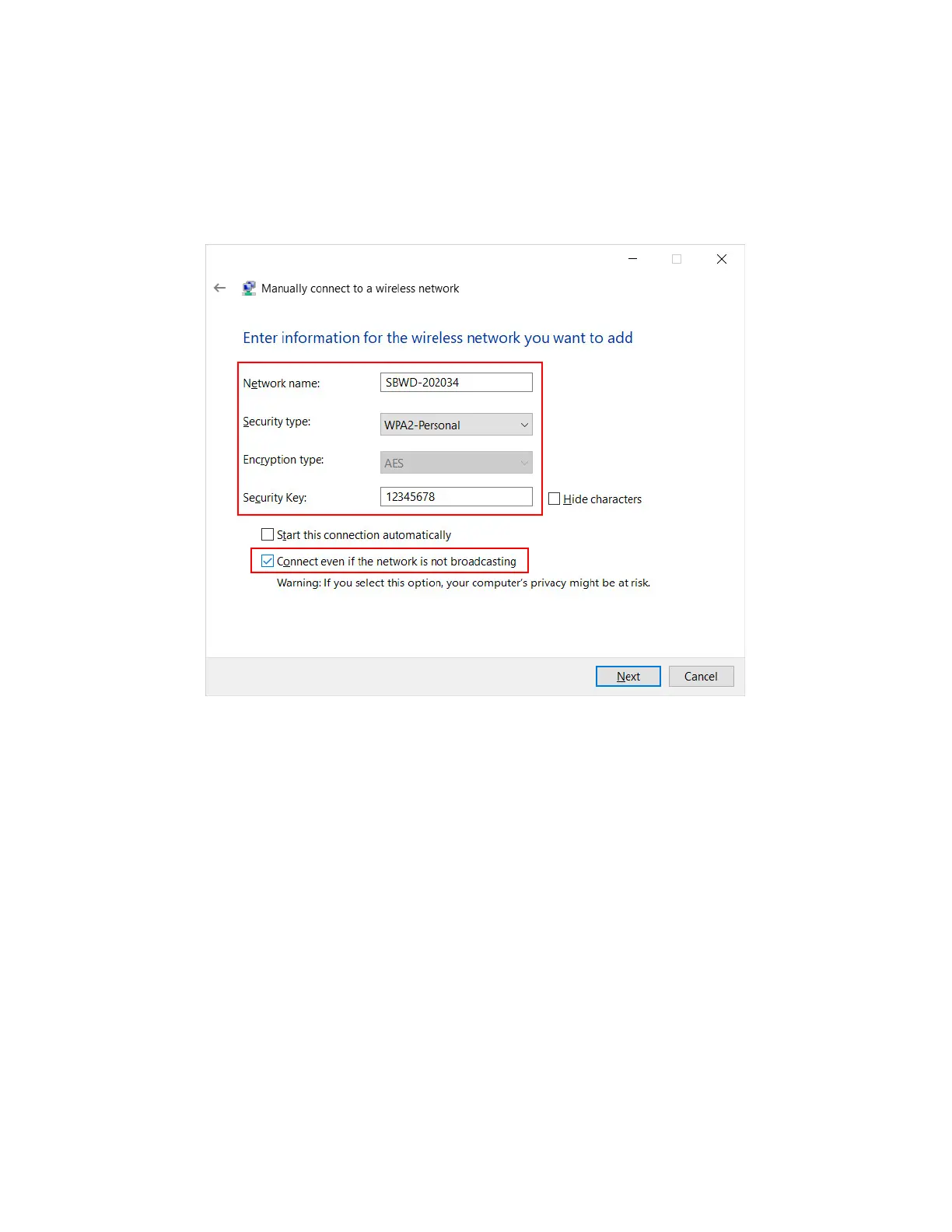 5. The Manually connect to a wireless network window appears. Type in or select the