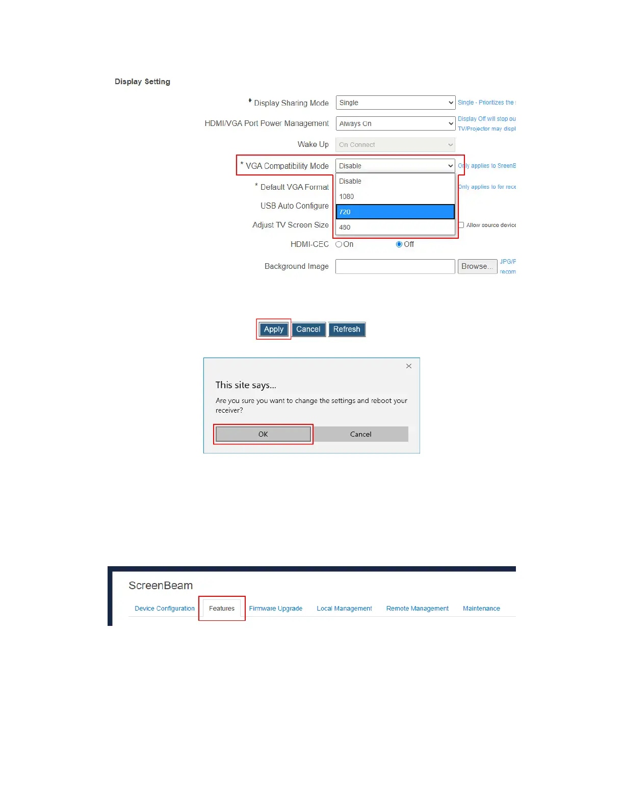 the best resolution automatically. Make sure you connect the ScreenBeam receiver