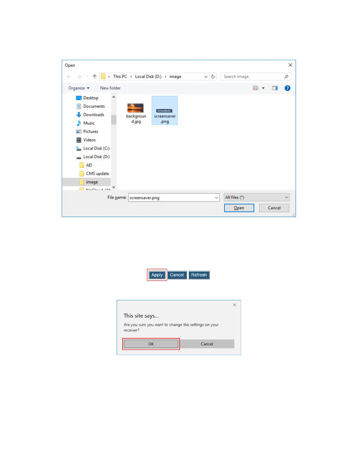 4. Click the Apply button to upload the screen saver image to the receiver.