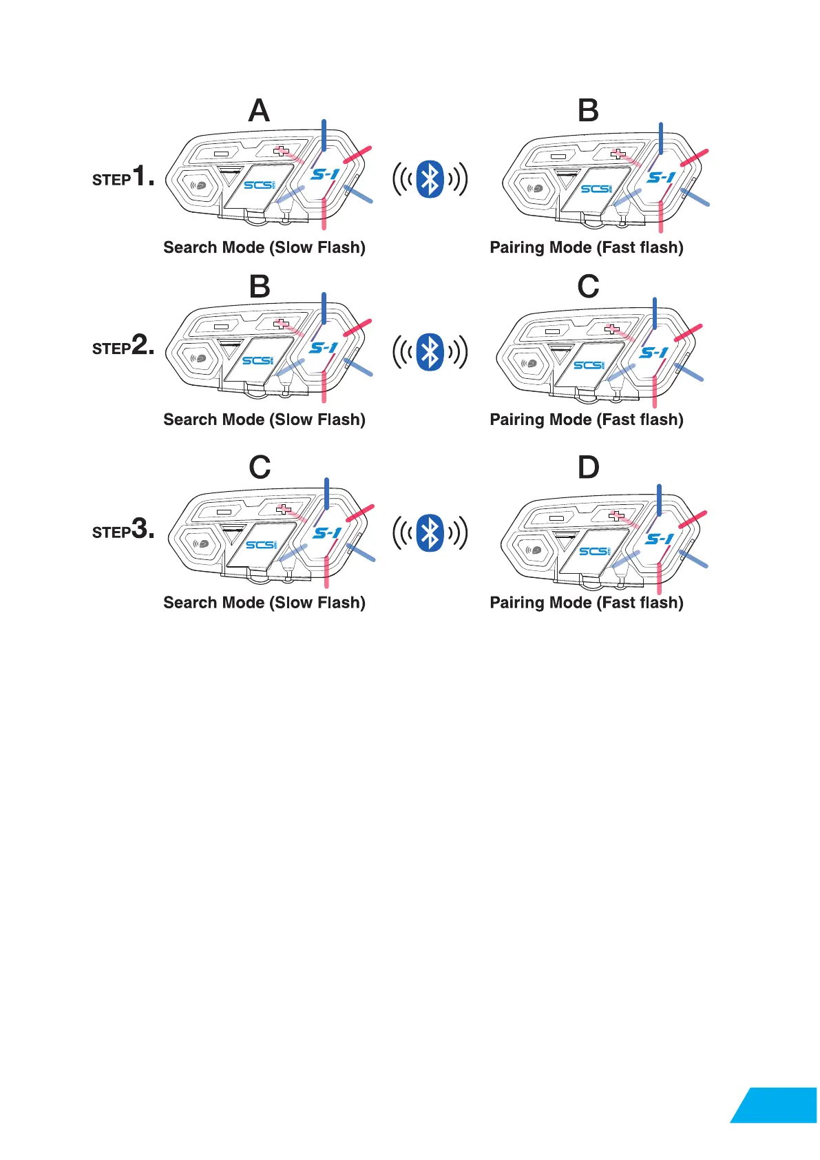indicator off , switch B unit to searching mode (details to 2.1.2), C unit to pairing mode