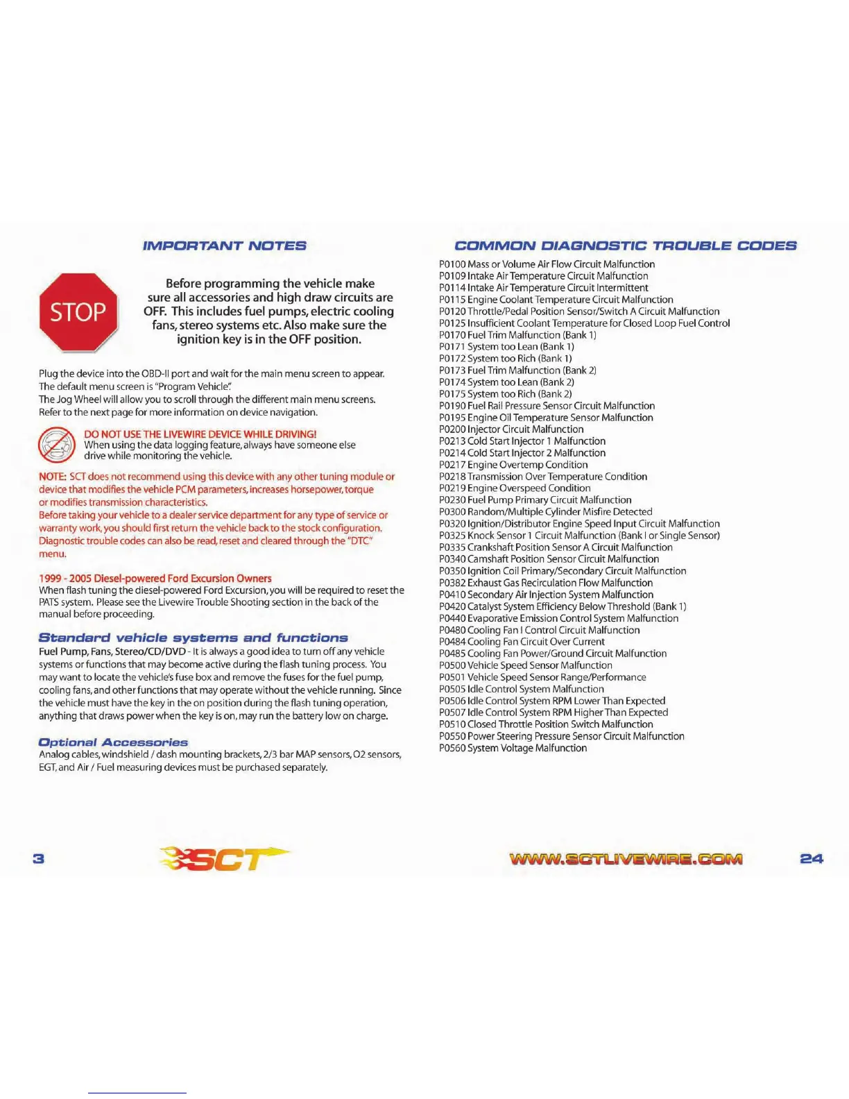 SCT 9600 - IMPORTANT NOTES AND WARNINGS; Vehicle Programming Preparation Steps; Prohibition on Driving While Using Device; Tuning Device Compatibility Warning