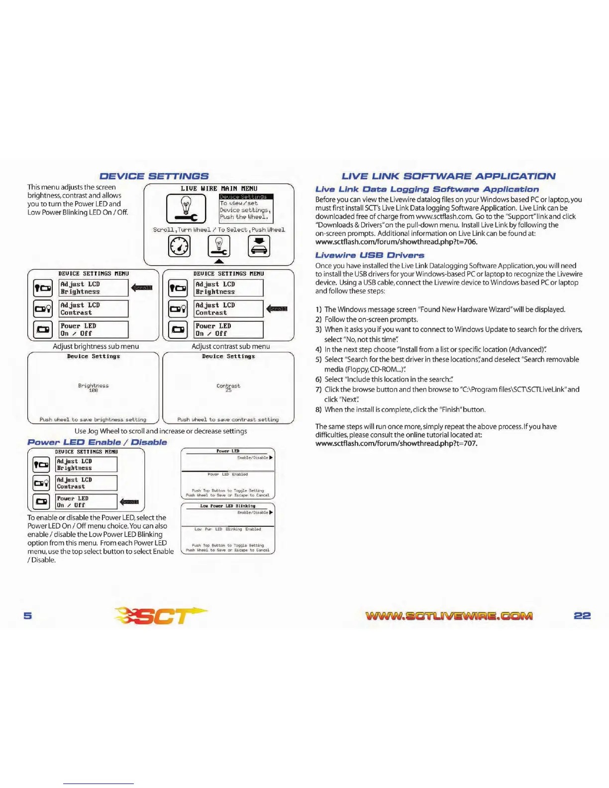SCT 9600 - DEVICE SETTINGS MENU; Screen Brightness and Contrast Adjustment; Power LED and Blinking LED Control; LIVE LINK SOFTWARE APPLICATION