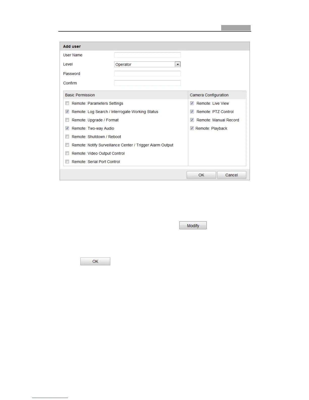 3. In the Basic Permission field and Camera Configuration field, you can check or