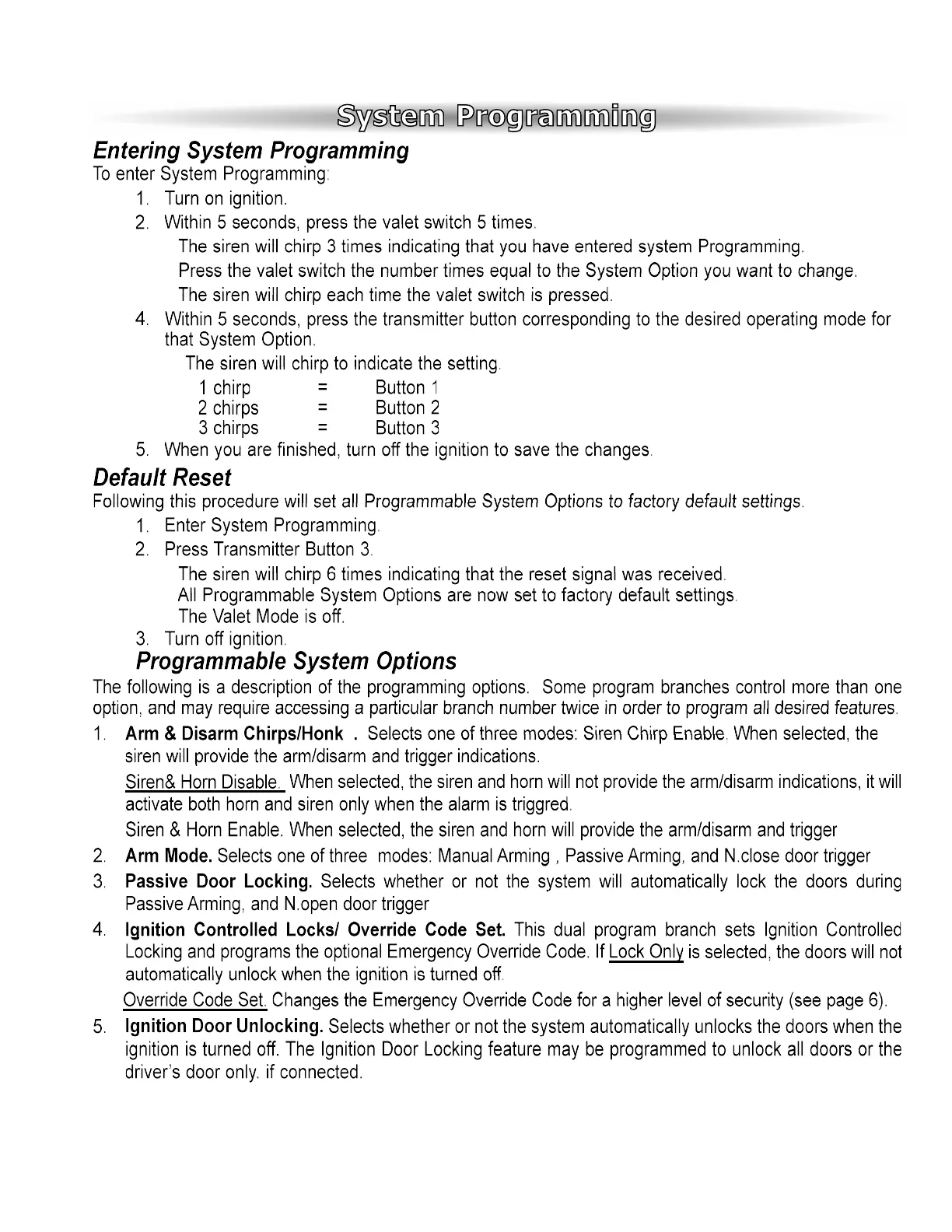 Scytek electronic A15 - System Programming; Entering System Programming Mode; Default System Reset; Programmable System Options Overview