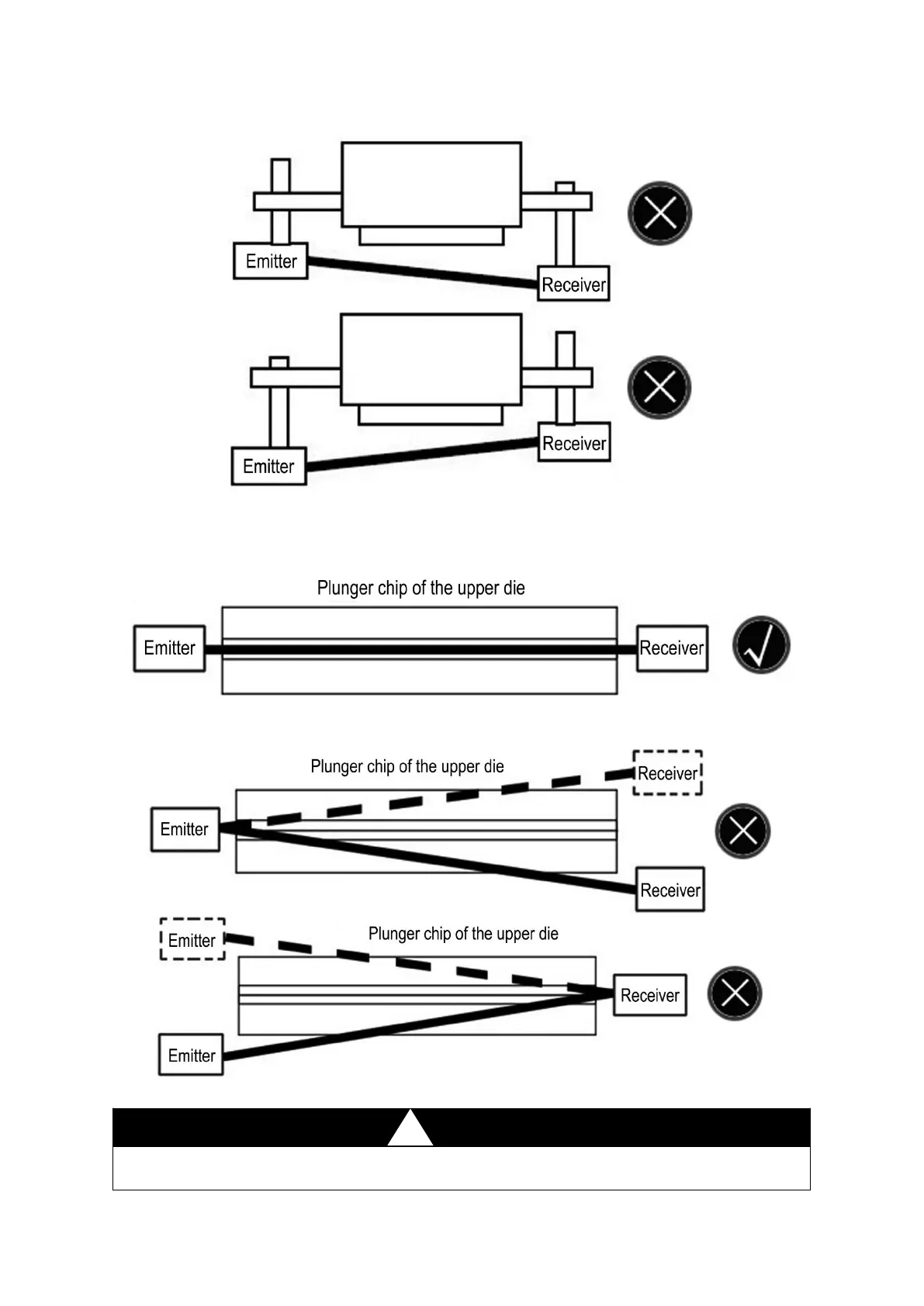 The emitter and receiver are not aligned right, the detecting beam does not parallel the upper die tip