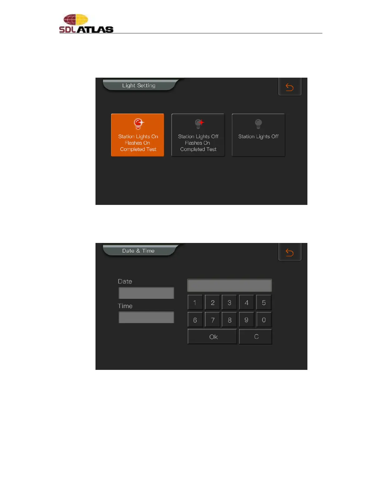 SDL Atlas Vortex M6 - Setting Menus: Lights and Time; Light Settings Adjustment; Date and Time Configuration