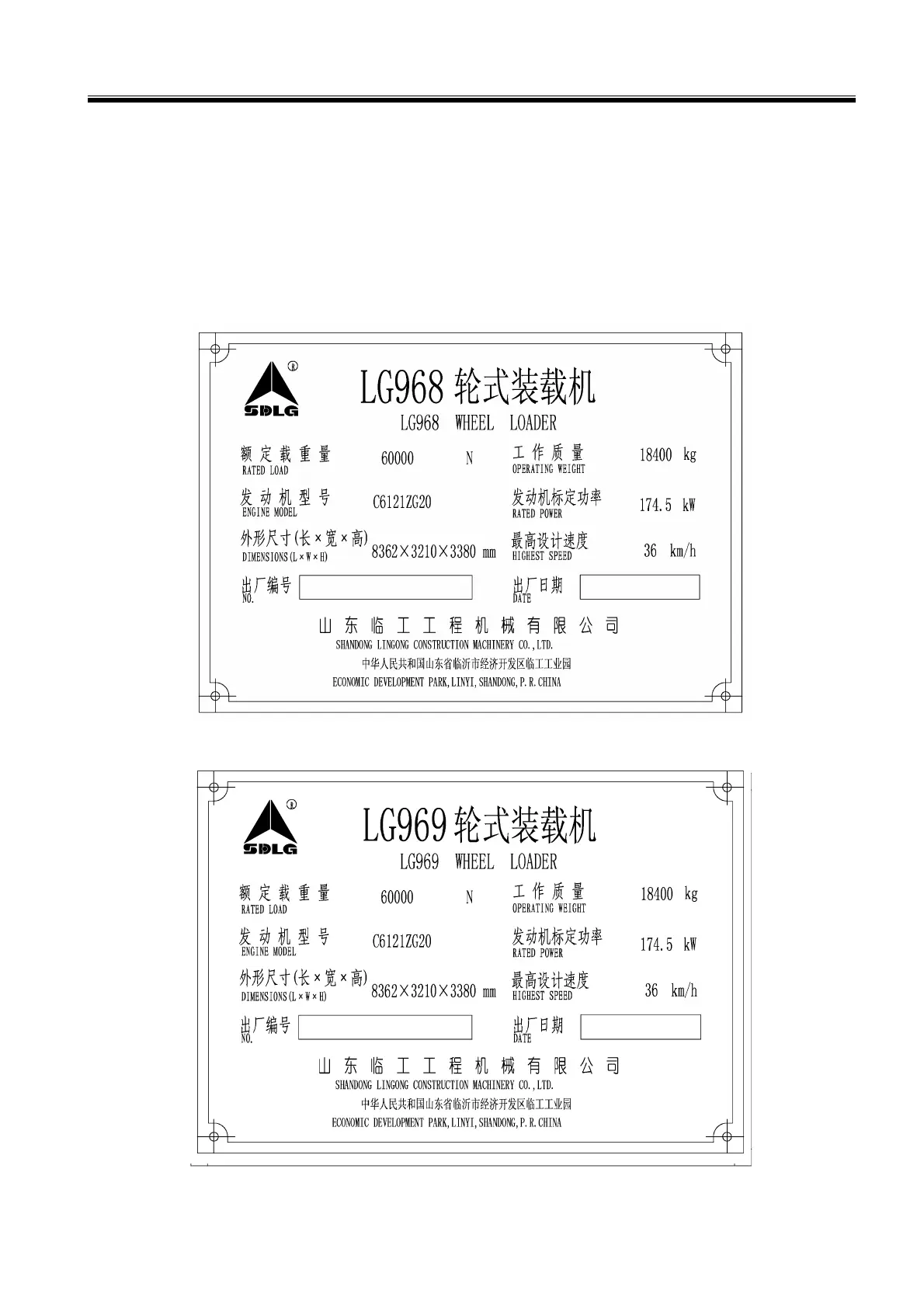 Figure 2-3 Nameplate of LG968 wheel loader mounted with standard lift arms