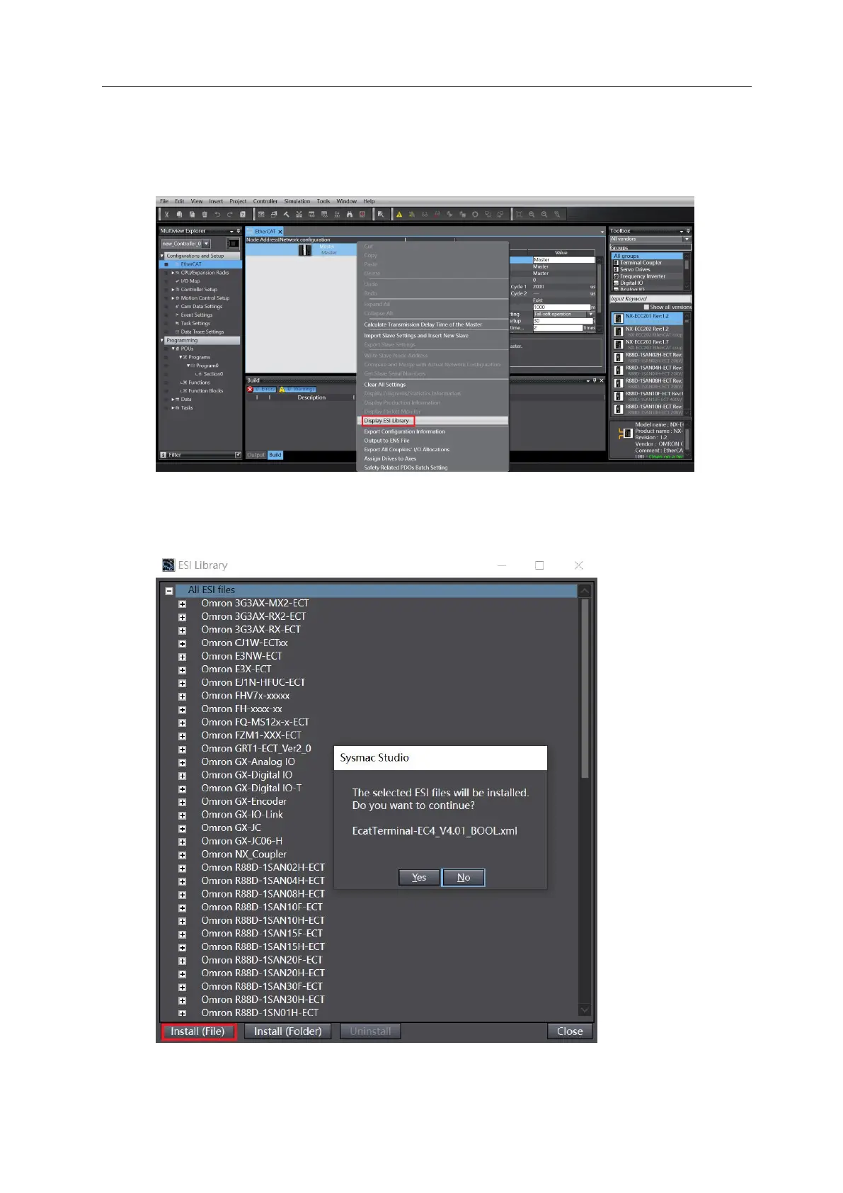 b. In the ESI Library window, click the Install (File) button, select the XML file path, and click the