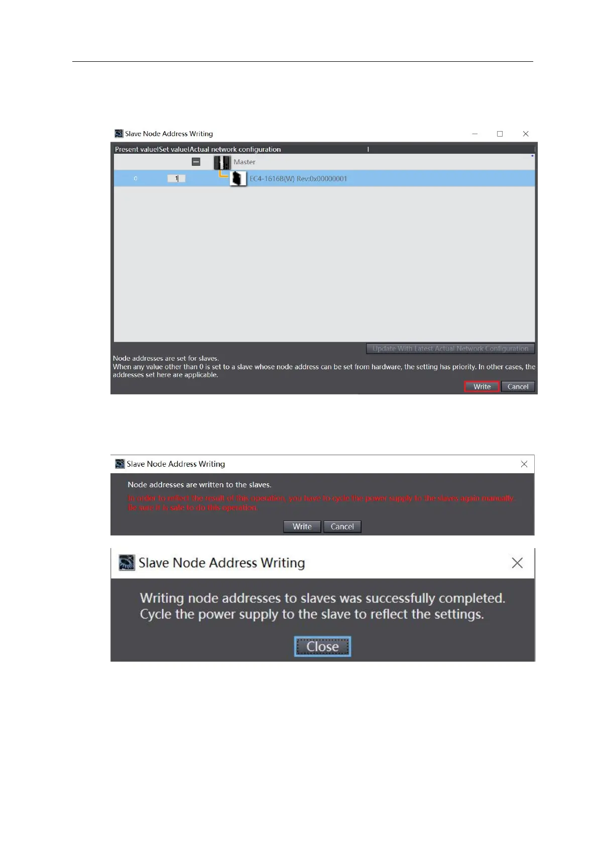 the node address, and click the "Write" button to change the slave device node, address, as shown