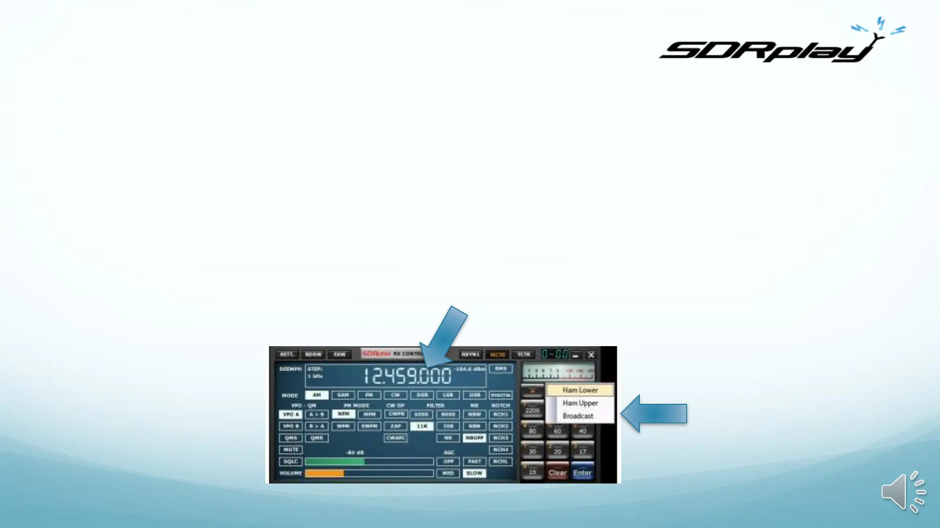 Look for the Bands button and select “Broadcast” and then the 49 metre band