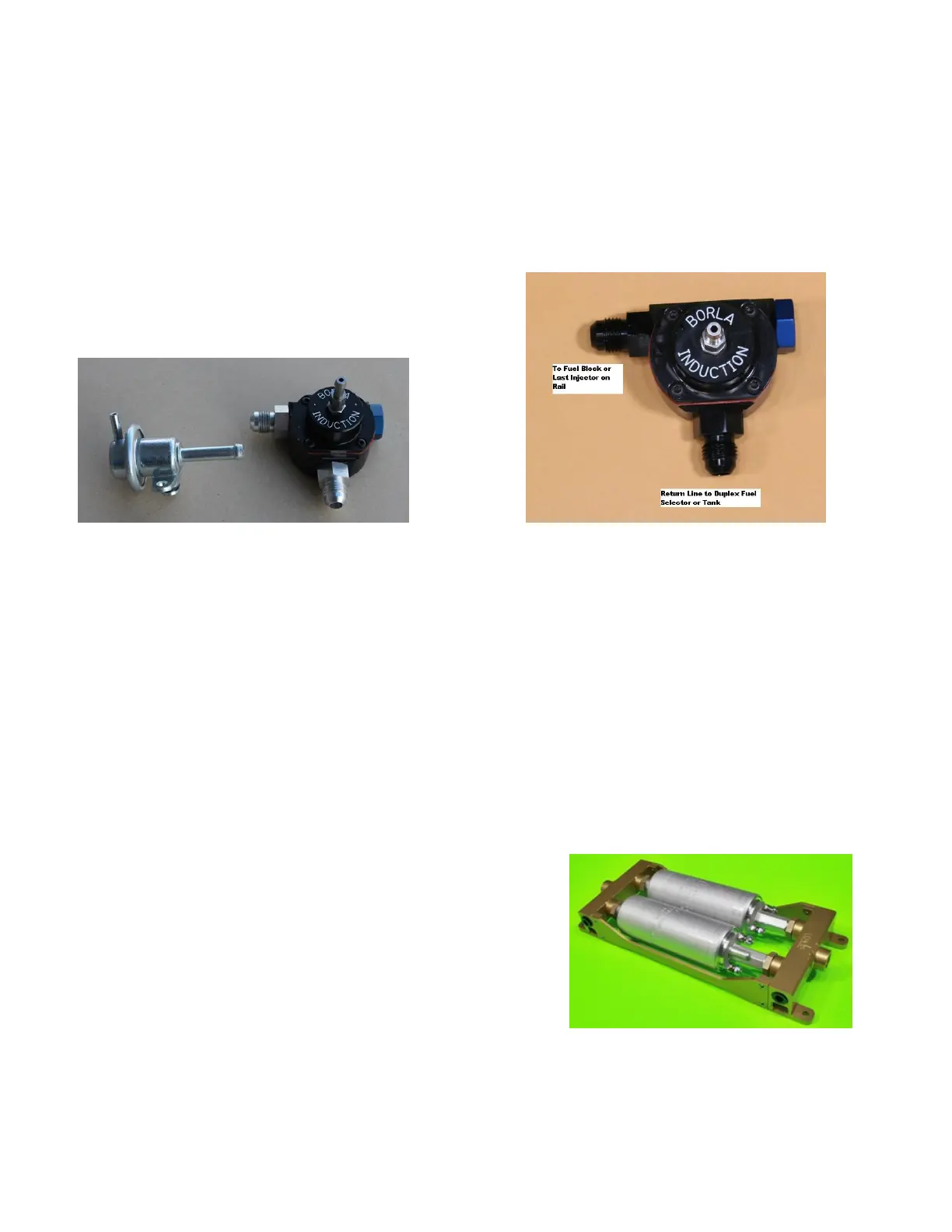 plug may be removed on the Borla regulator for tapping off fuel pressure. Threaded mounting holes are