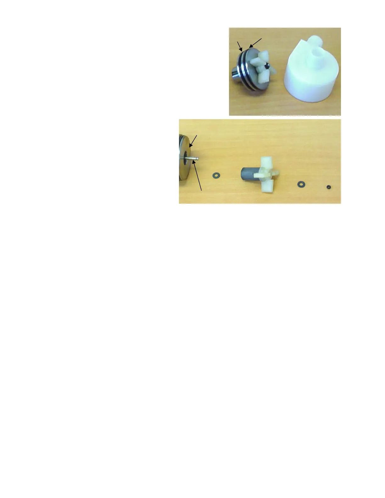 magnet on the shaft. Replace the other thrust washer and o-ring on the shaft, above the impeller, pushing hard