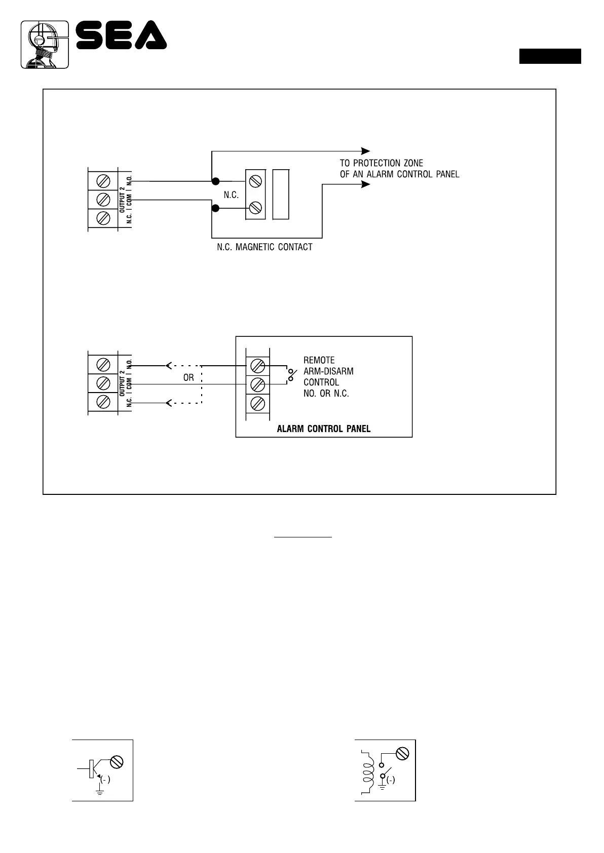 • Use the (N.O.) or (N.C.) output contact to make arm-disarm control of an alarm system.