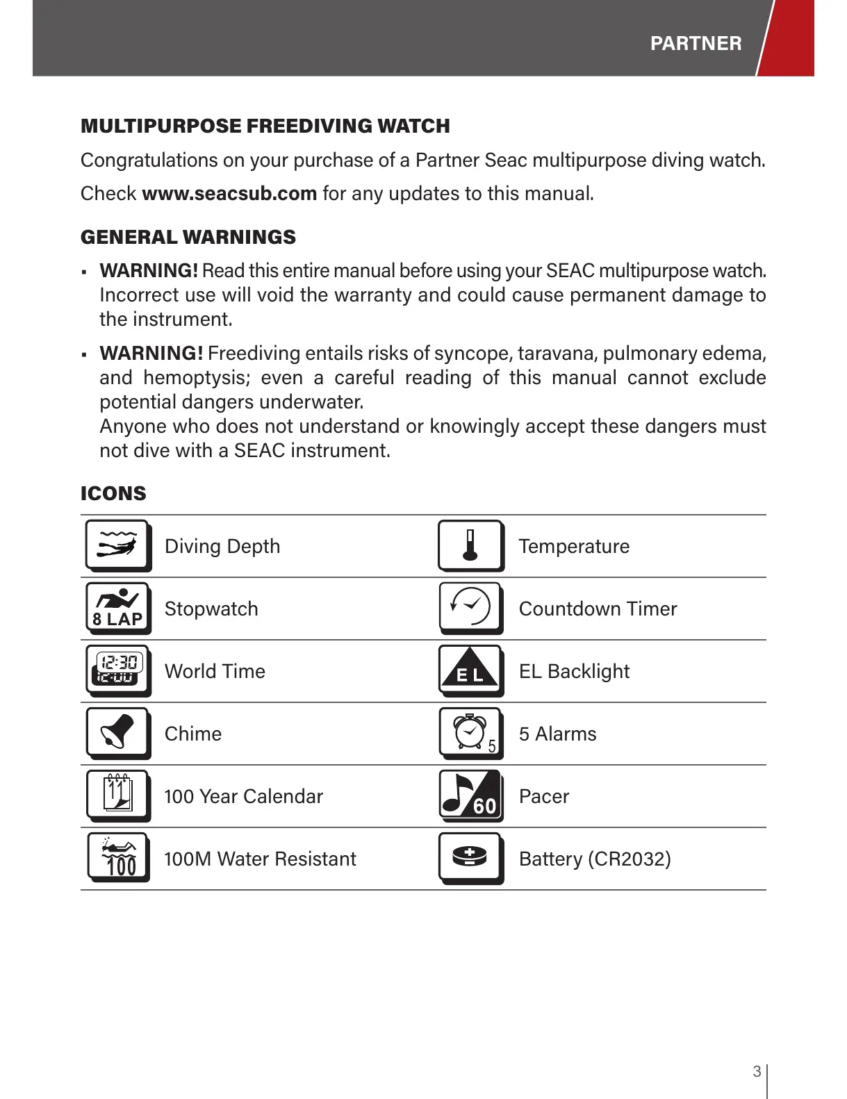 Congratulations on your purchase of a Partner Seac multipurpose diving watch.