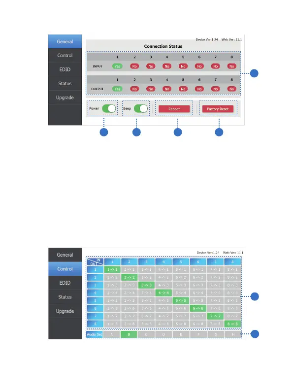 ① Display currently the Matrix input and output port status. The “yes” have