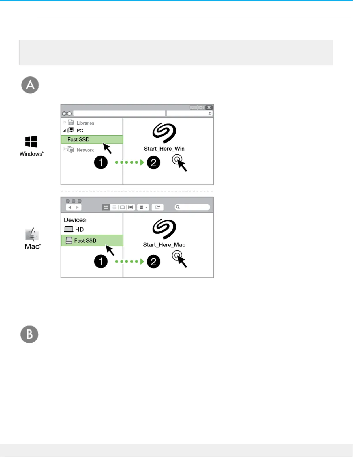 Using a file manager such as Finder or File Explorer, open BarraCuda Fast SSD and launch Start Here Win