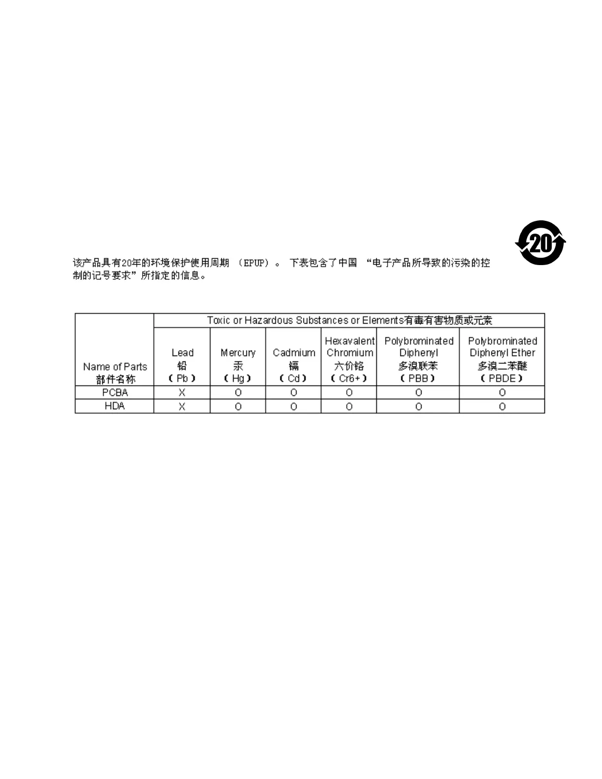 This product has an Environmental Protection Use Period (EPUP) of 20 years. The following table contains
