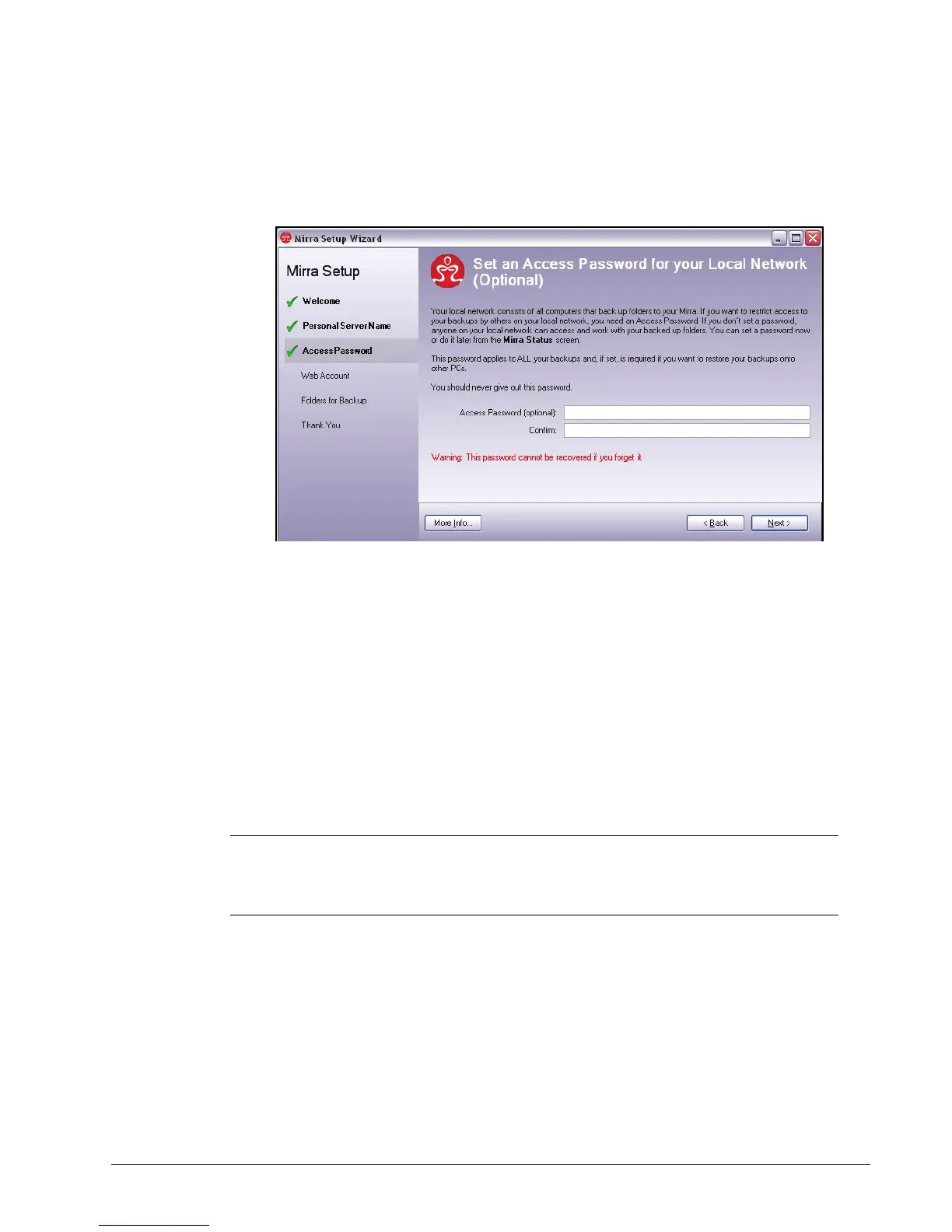 Caution: Mirra cannot recover your Access Password for you. If you forget your