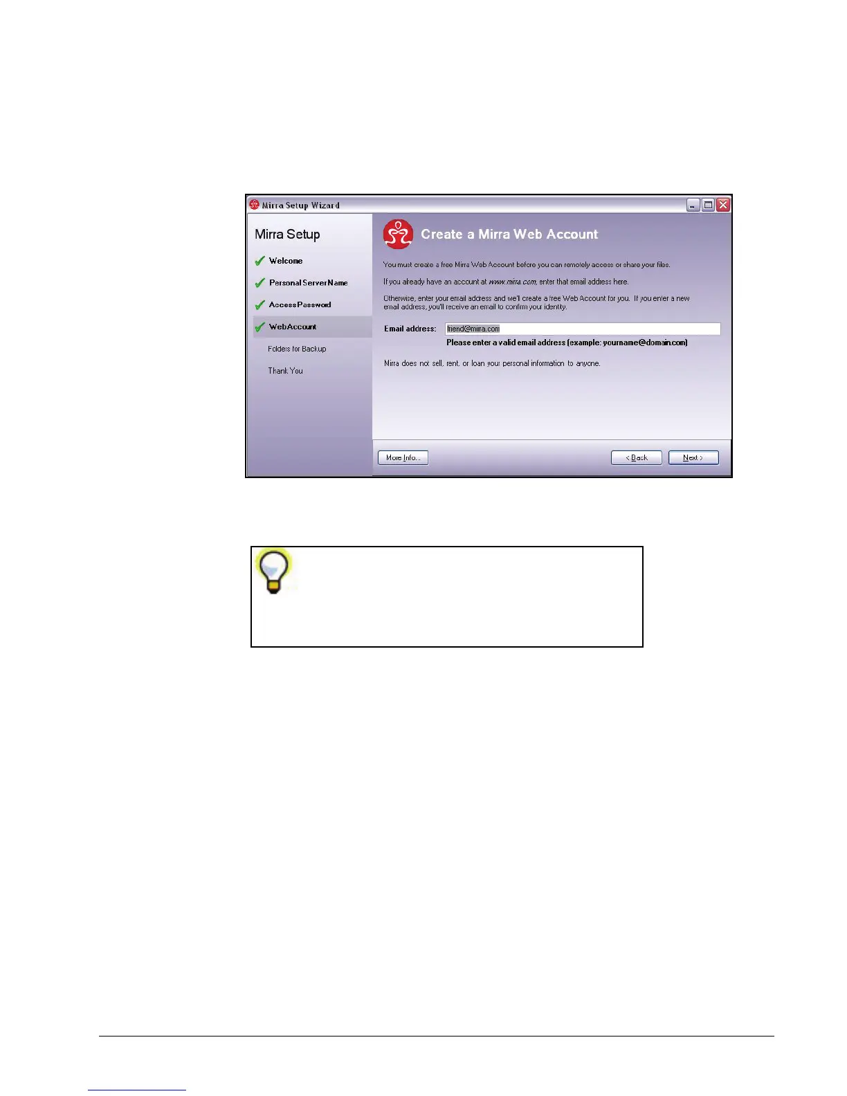 The Create a Mirra Web Account window helps you create a free Mirra Web