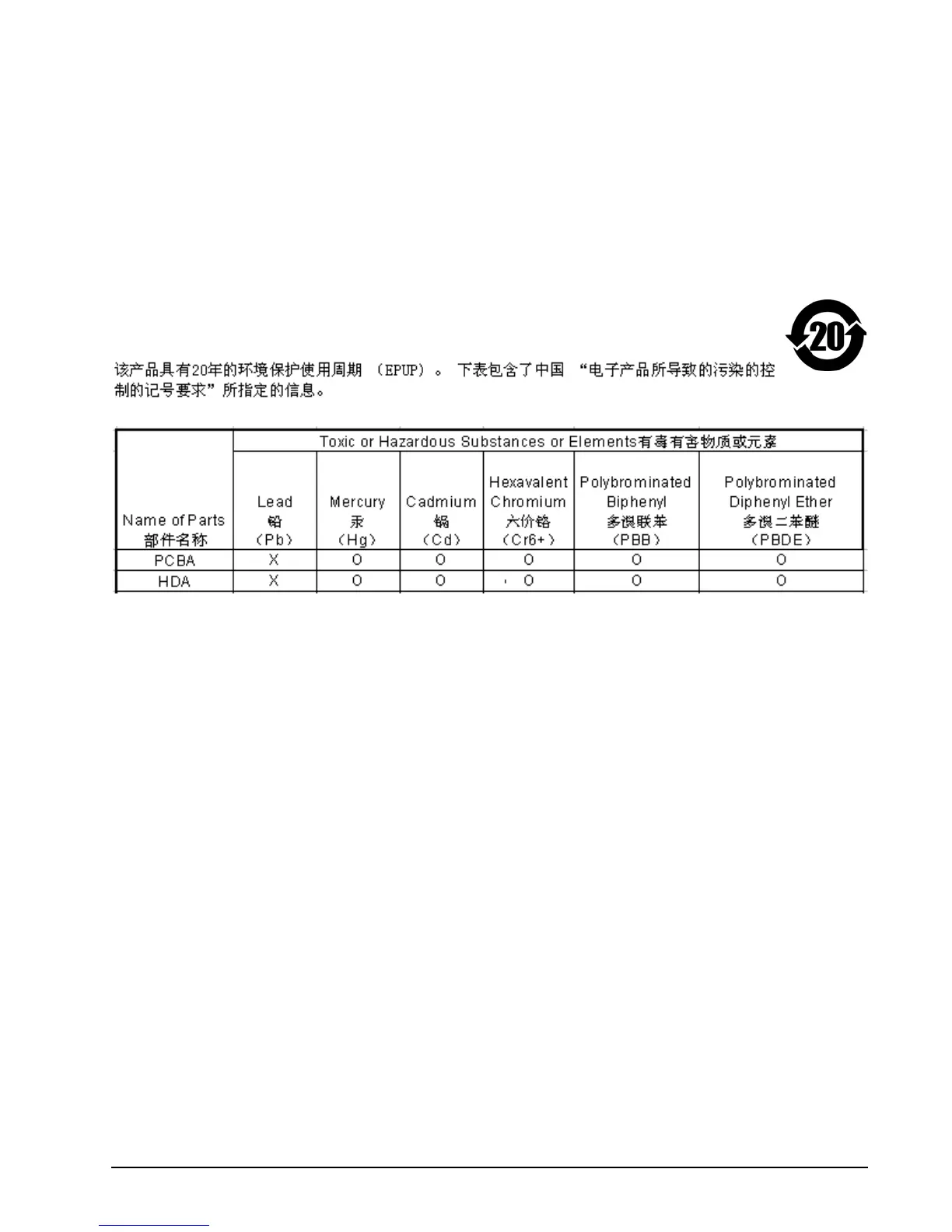 This product has an Environmental Protection Use Period (EPUP) of 20 years. The following