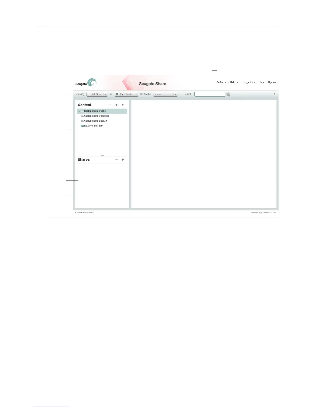 • Content panel: Lists your three GoFlex Home folders. Any external USB drive connected