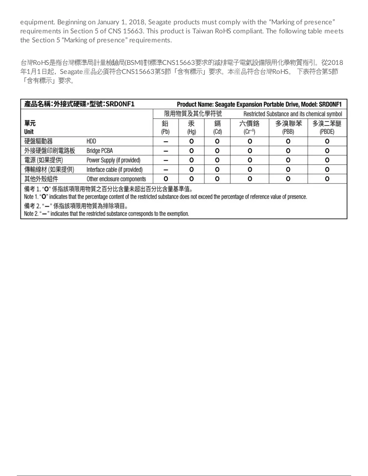 年1月1日起,Seagate產品必須符合CNS15663第5節「含有標示」要求。本產品符合台灣RoHS。 下表符合第5節