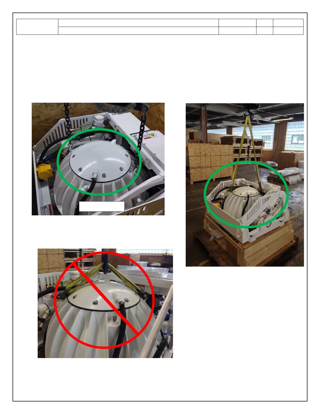 green circles show acceptable methods to lift the gyro, such as a spreader bar or long lift slings.