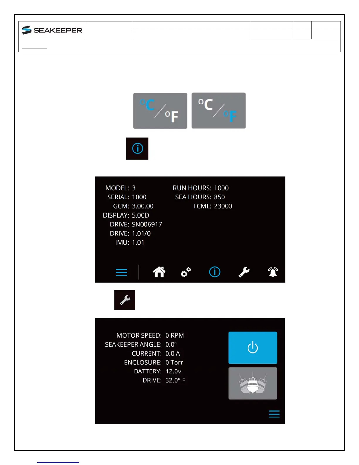7) The service page displays operating information from the Seakeeper.