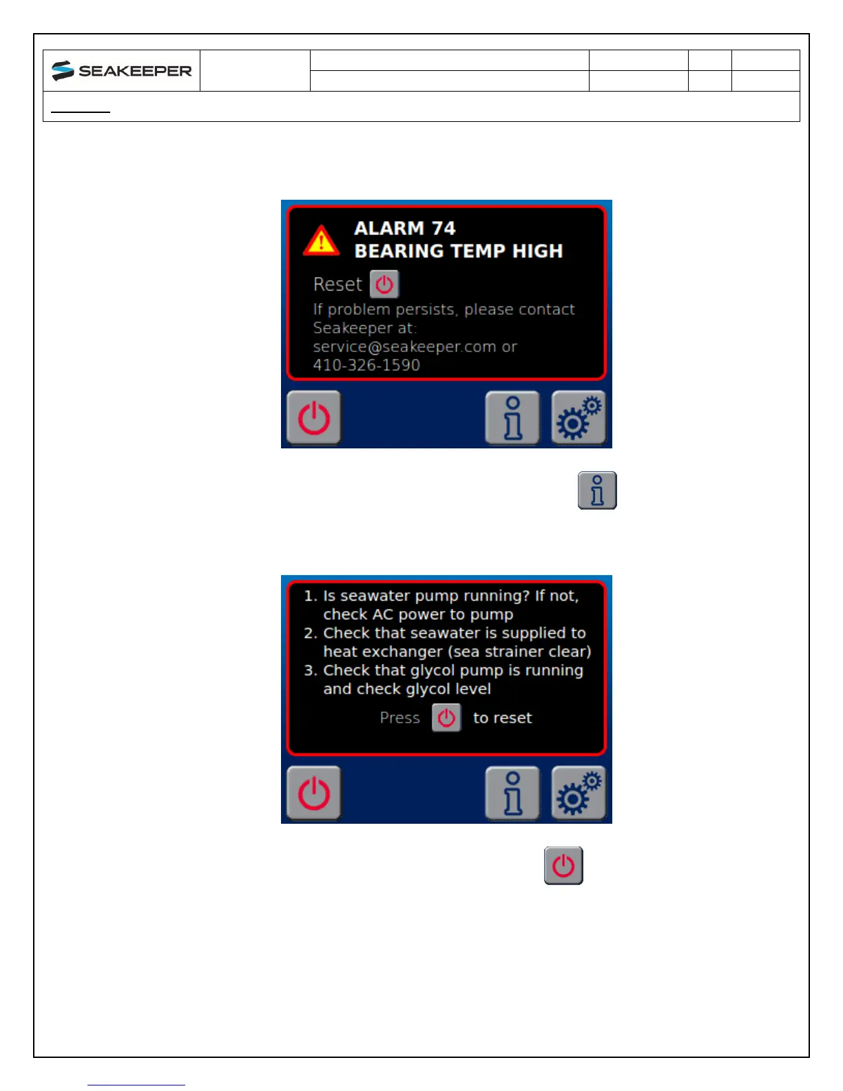 To reset the ALARM utilize the Seakeeper ON/OFF button