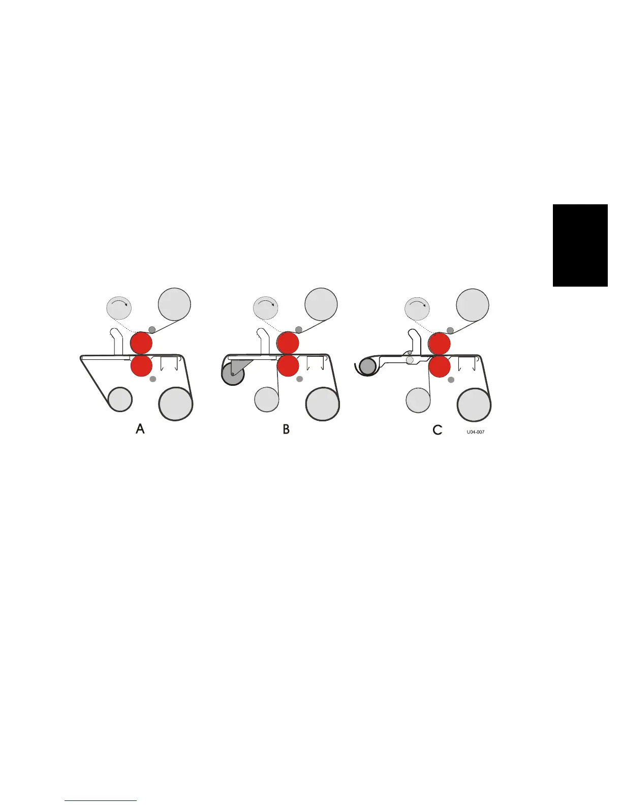 8. Push the films with a leader panel (C) into the nip using slow mode (B).