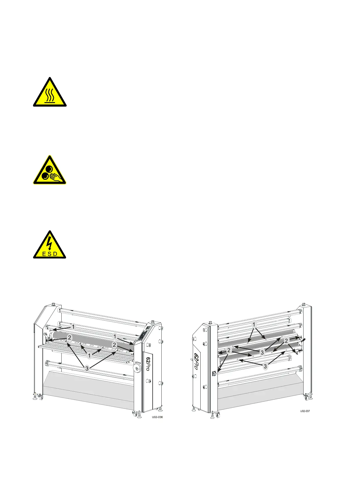 von Auslegewalzenspalt und Zugwalze Warnsymbole gegen elektrostatische Entladungen.