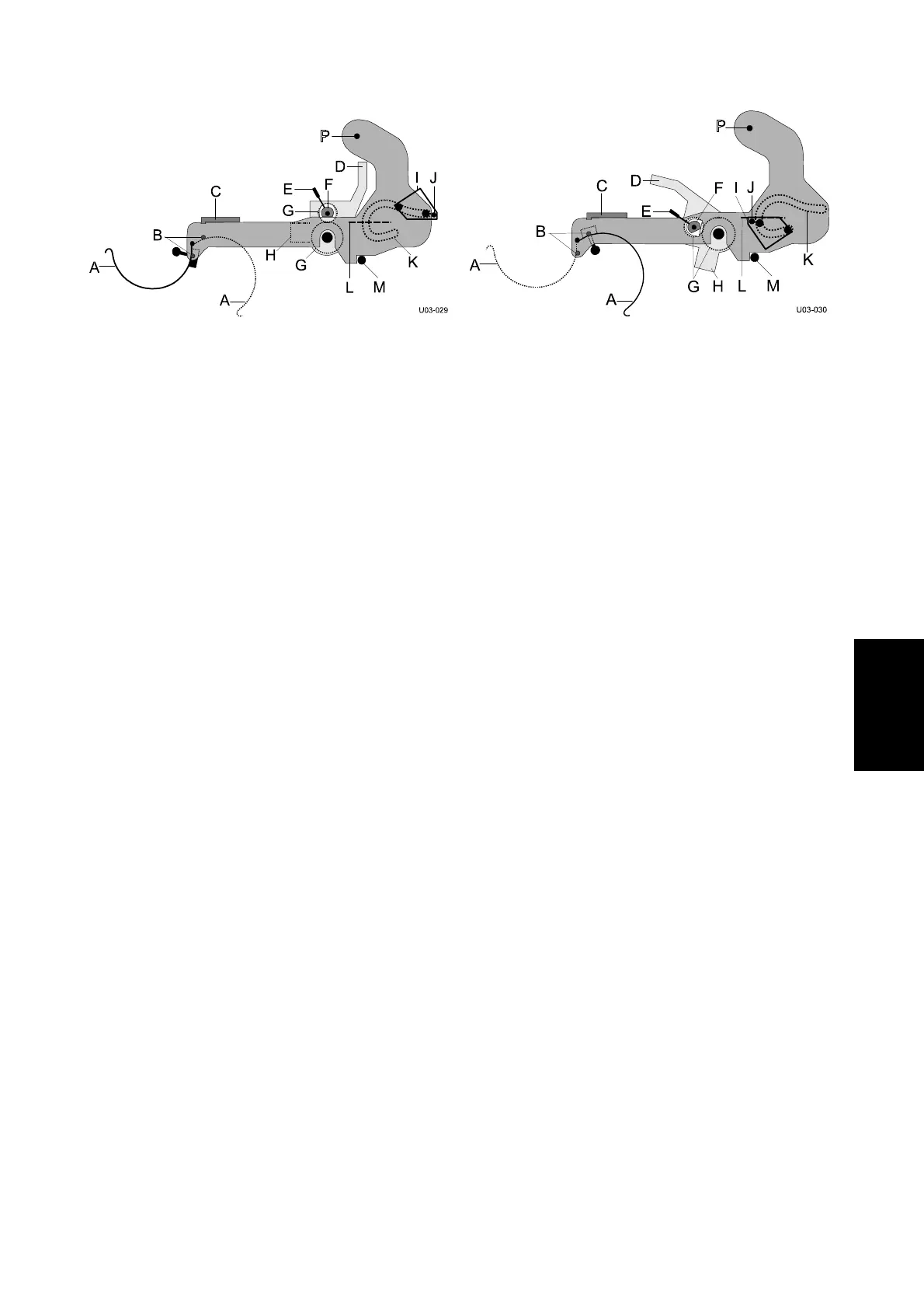 Die obere Walze kann mithilfe des Hebels (E), der einen Exzenter (F) auf der Welle