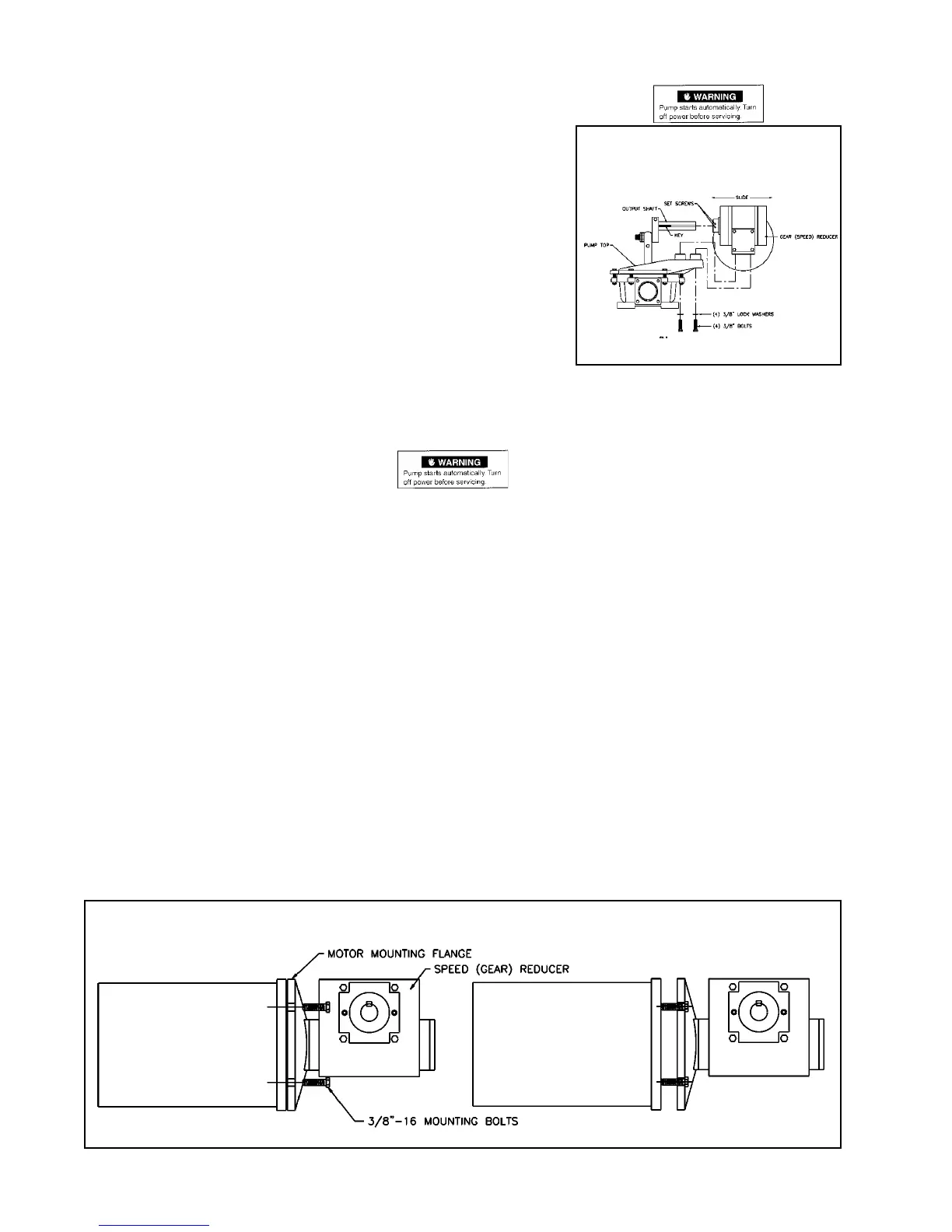6. The speed (gear) reducer motor mounting flange has two threaded holes for forcing the motor off. Use two of