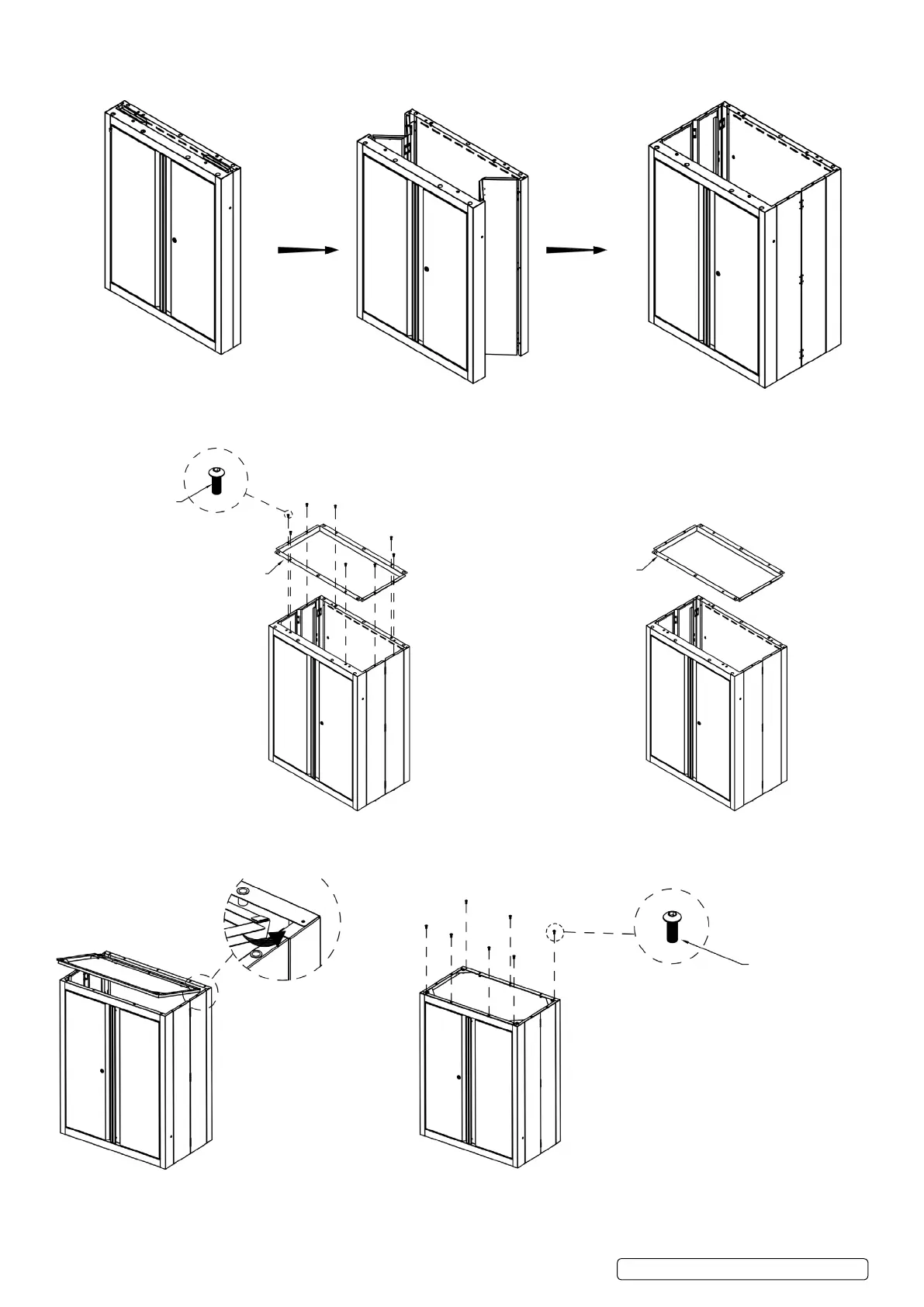 STEP 4 TOP CABINET: Turn the cabinet over. Attach the bottom panel using 7x M6x16mm screws.