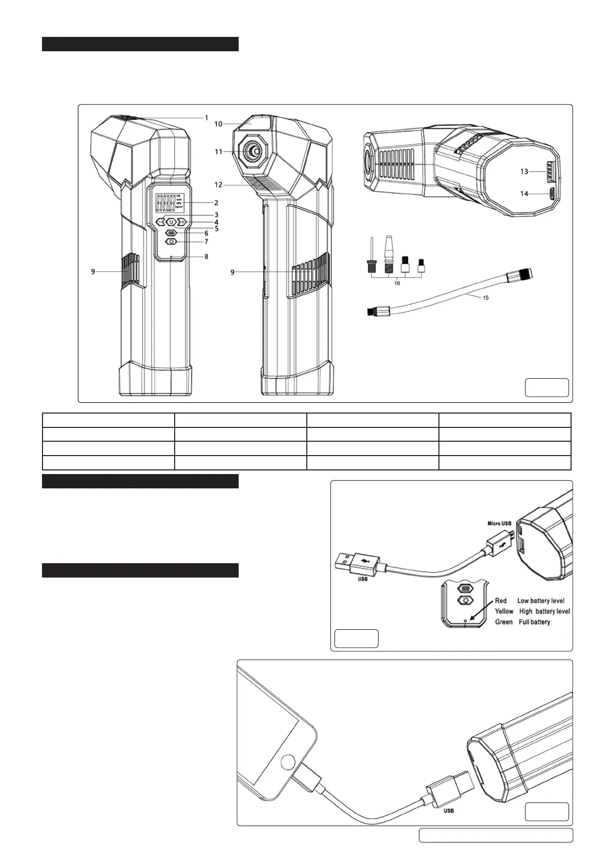 13.USBoutputport 14.MicroUSBinputport 15.Airhose 16.4×Valveadapters