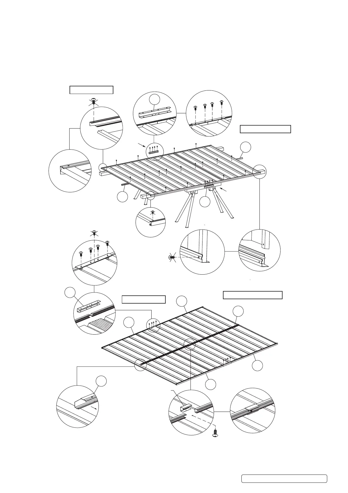 Now fix parts 34R and 34L (mid wall channels) joined by mid wall channel connector to the sheeting with self-tapping screws. Please
