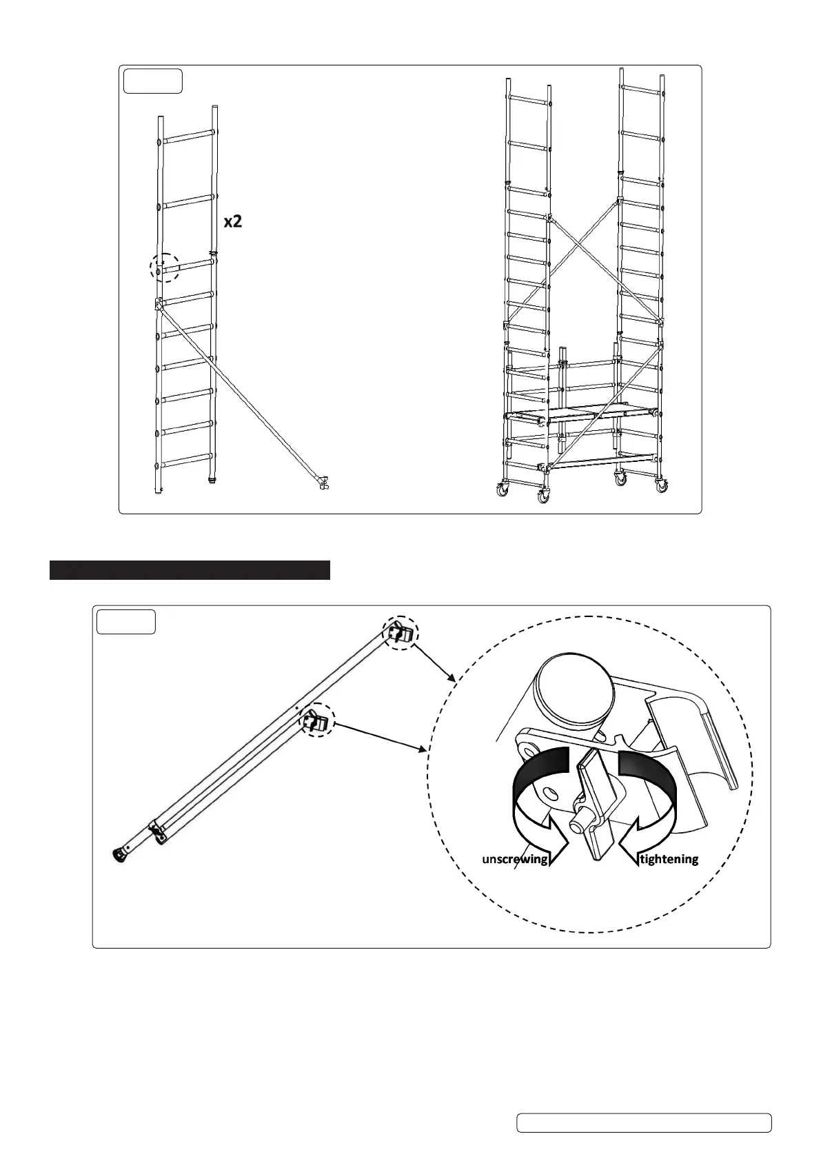 7.1.1. Place the ‘2-rung’ ladder onto the ‘7-rung’ ladder and pre-assemble the diagonals as shown in the diagrams below (g.16).