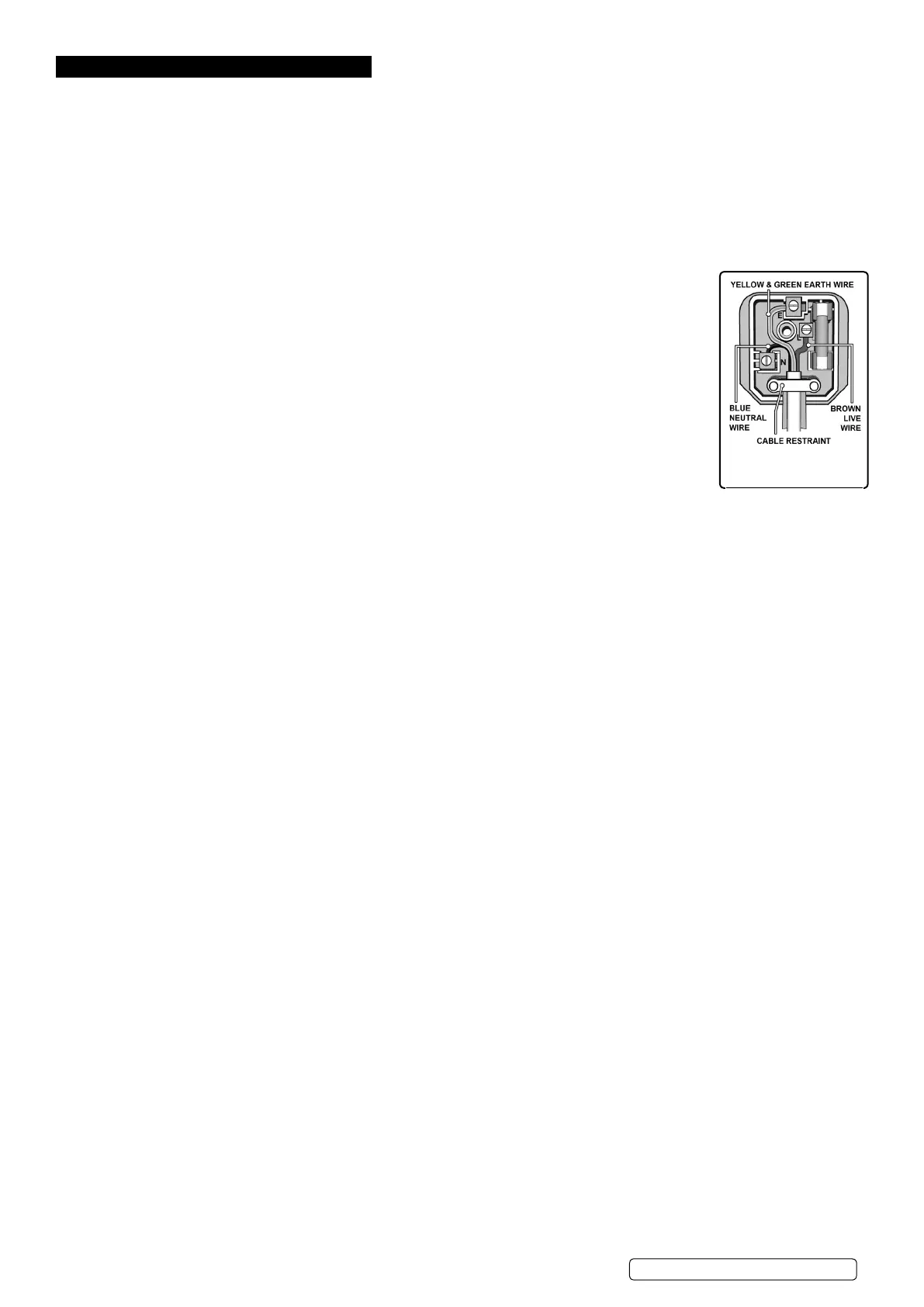 Replace a damaged plug with a BS1363/A 13 Amp 3 pin plug. If in doubt contact a qualied electrician.