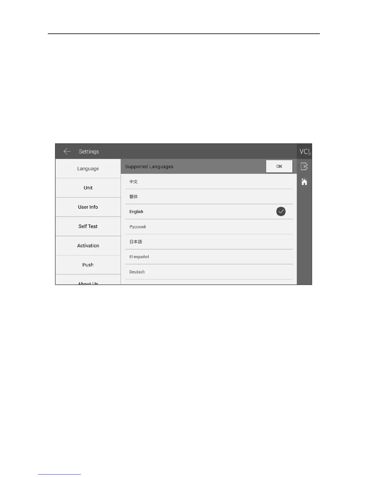 Set Language, Units, User Info, Self-Test, Activation, Push Notifications,