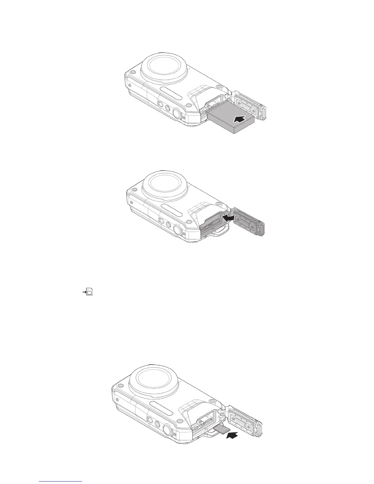 2) Insertthebatteryasshownwiththe3goldcontactsorientedtowardsthetopofthecamera.
