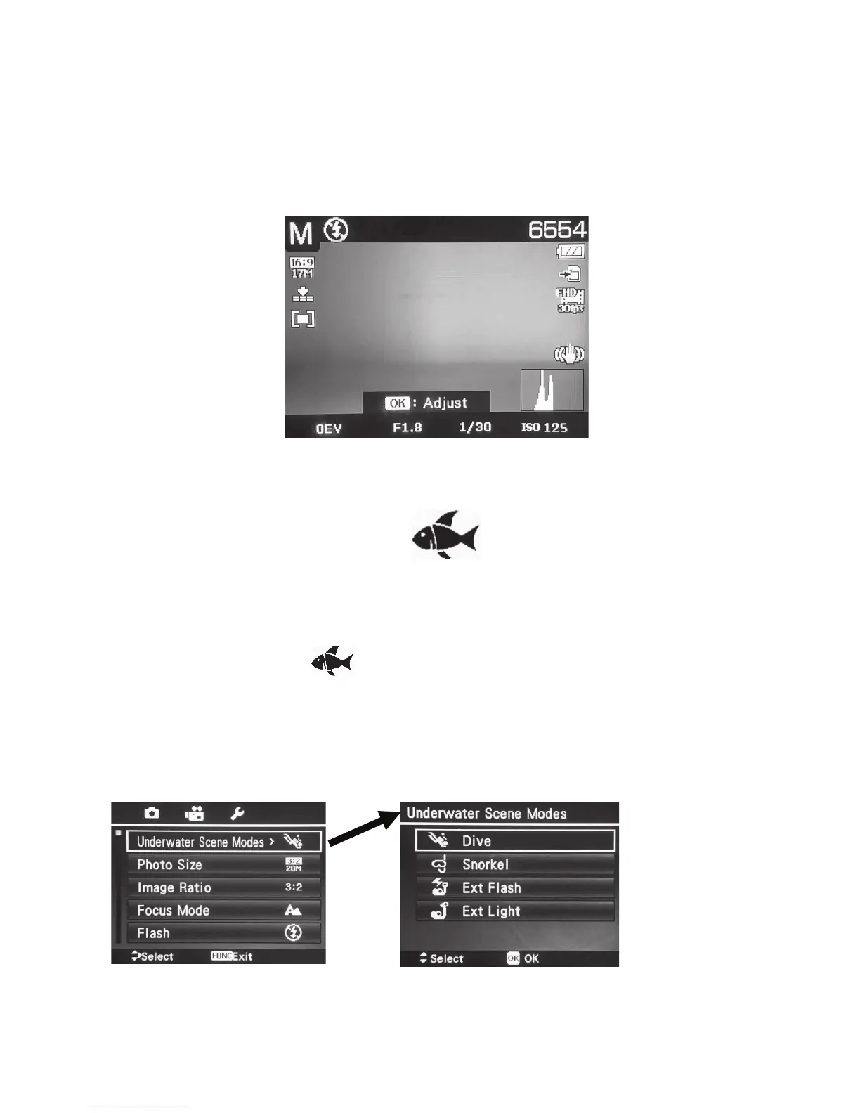 2. PushtheMenubuttontosettheappropriateunderwaterscenemodes.Seetablebelow