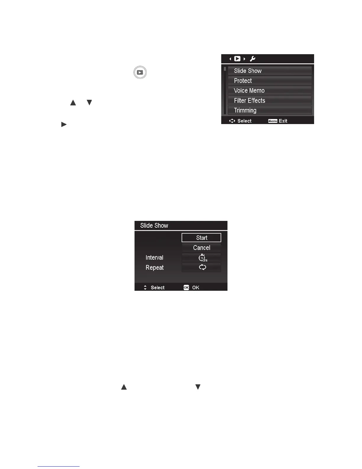 1. FromthePlaybackmenu,selectSlide Show andpushtheOKbutton.TheSlideShowmenuwill