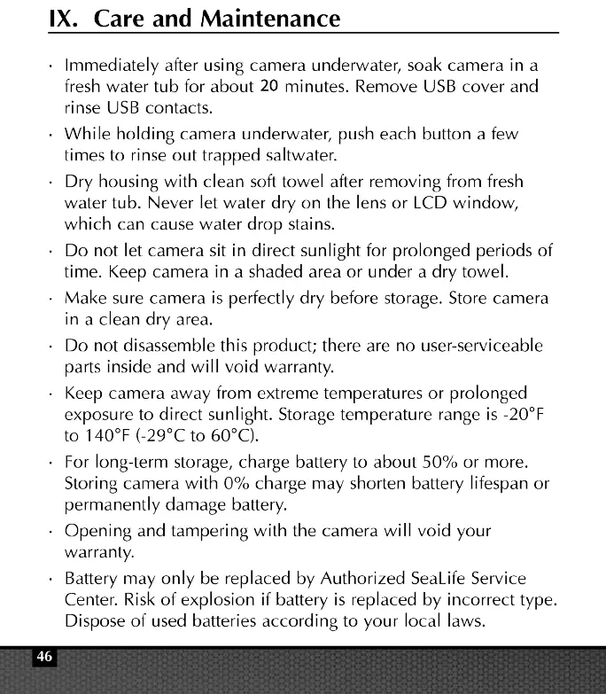Sealife micro 2.0 - Care and Maintenance; Underwater Cleaning and Drying; Storage, Temperature, and Battery Care