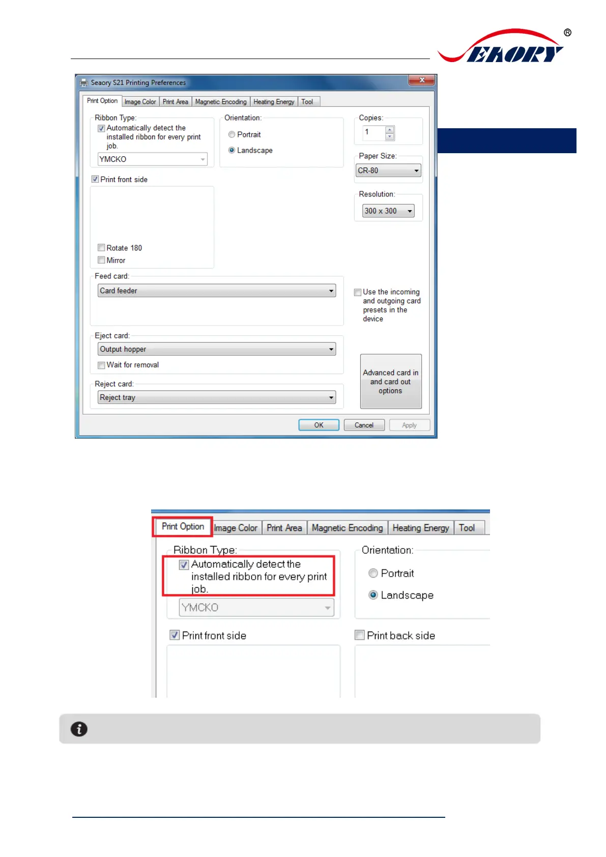 1Automatically detect the installed ribbon for every print job is default chosen.