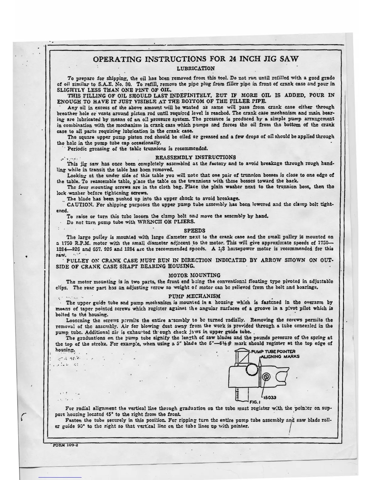 Sears 103.0403 - OPERATING INSTRUCTIONS; LUBRICATION; REASSEMBLY INSTRUCTIONS; SPEEDS