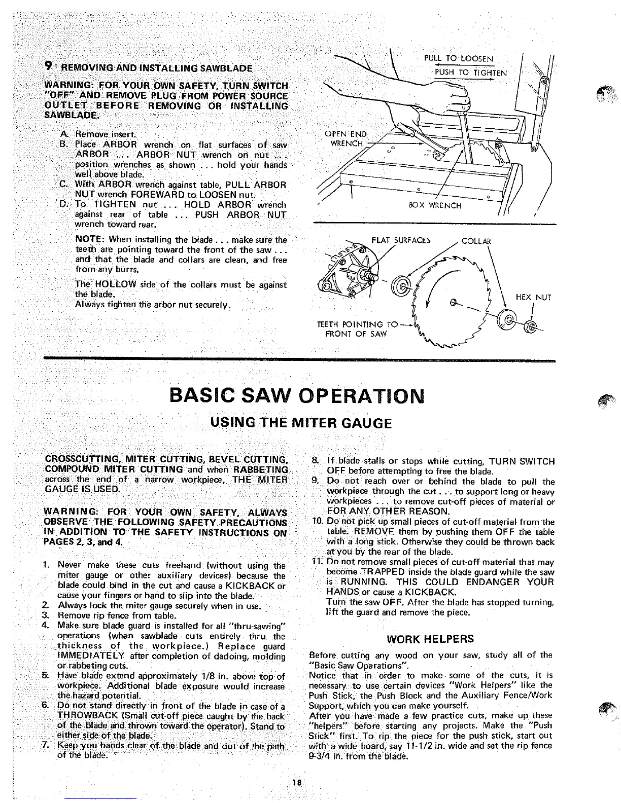 Sears 113.240421 - Basic Saw Operation; Using the Miter Gauge; Removing and Installing Sawblade; Work Helpers