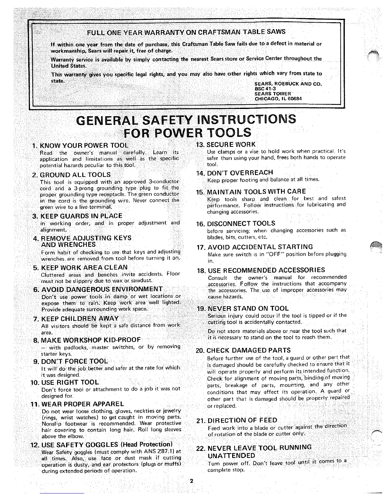 Sears 113.240421 - General Safety Instructions for Power Tools; Fundamental Safety Practices; Protective Gear and Work Area Safety