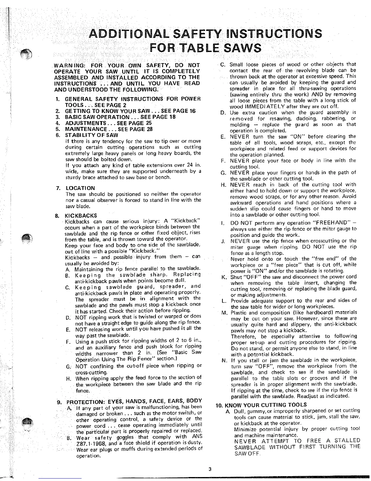 Sears 113.240421 - Additional Safety Instructions for Table Saws; Saw Stability, Location, and Kickback Prevention; Operator Protection and Tool Care