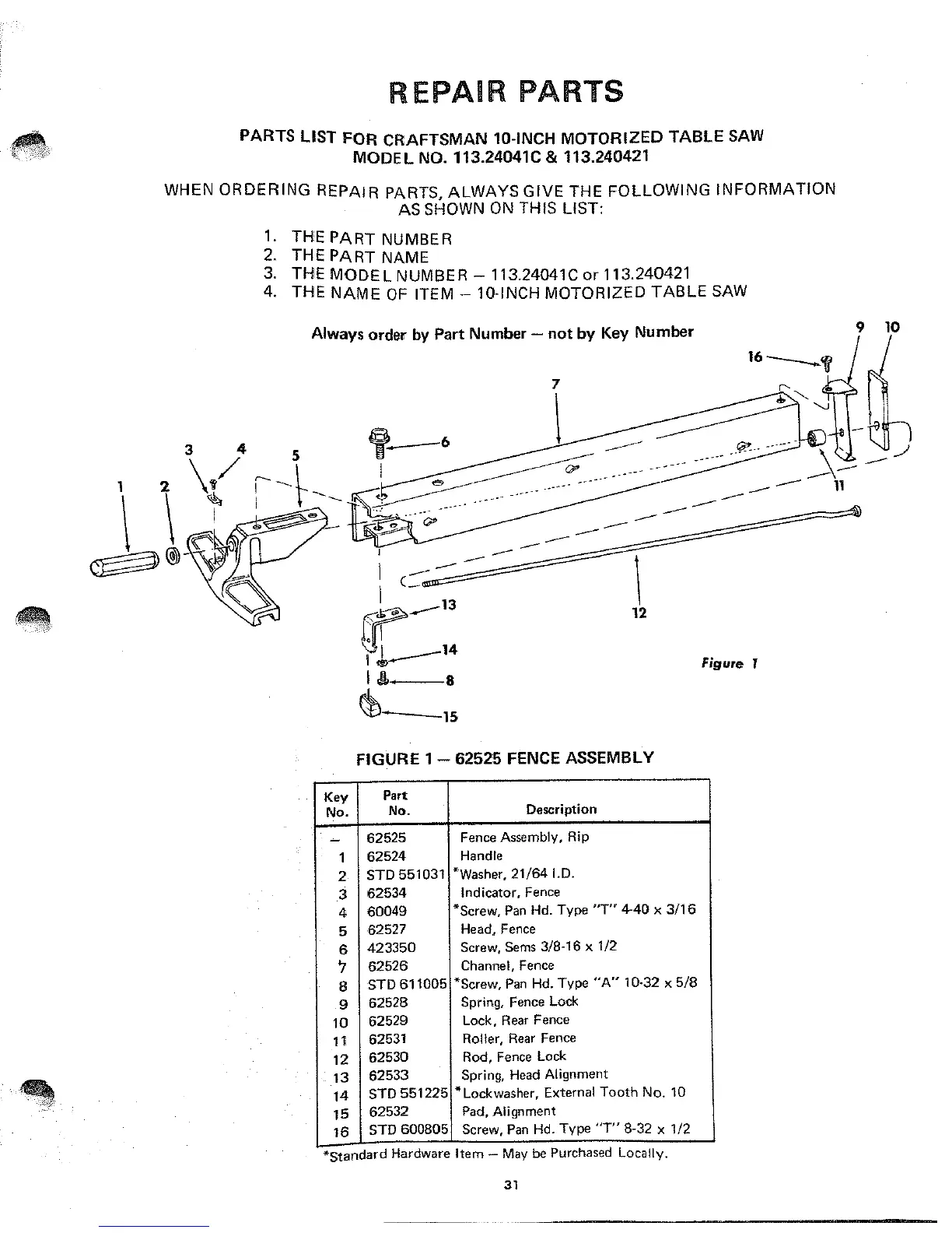Sears 113.240421 - Fence Assembly Exploded View and Parts List